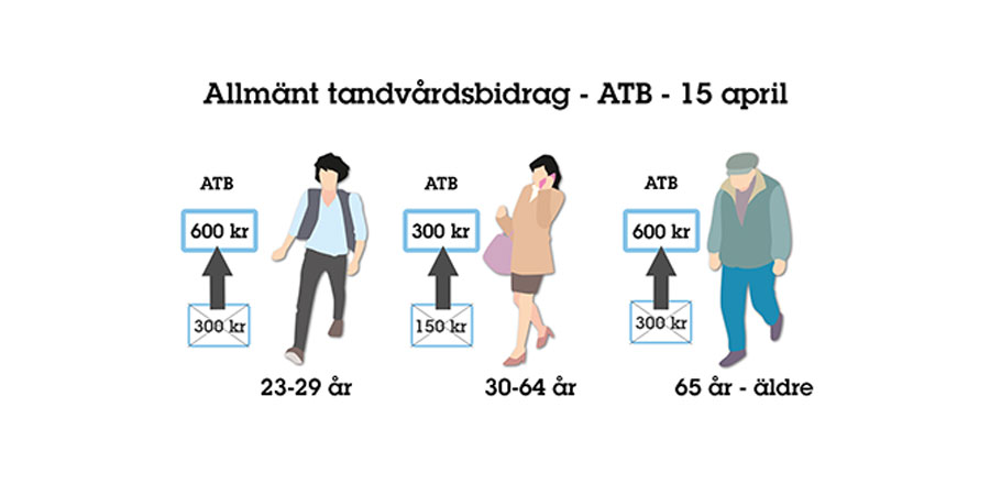 Bra att veta! Det allmänna tandvårdsbidraget (ATB) höjdes med 100 procent i år. Detta enligt regeringens budgetproposition. Tandvårdsbidraget höjdes från 300 kronor per år till 600 kronor per år för alla mellan 22 och 29 år och alla 65 år eller äldre.
